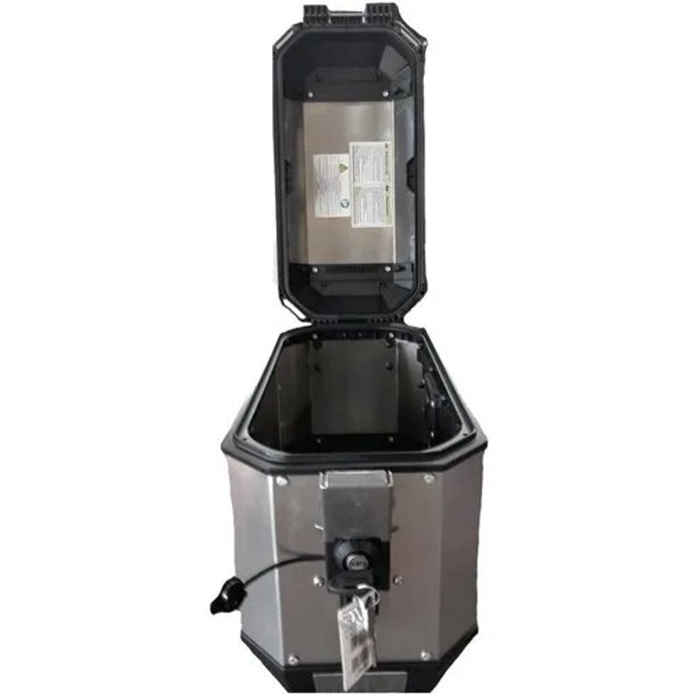 par de Malas Laterais Monokey® Trekker Alaska com Acabamento em Alumínio Natural, 36 Litros, Equipadas com Cilindros de Fechadura Correspondentes e Um Terceiro Cilindro de Fechadura Correspondente Para Montagem de Uma Caixa Superior Separada.